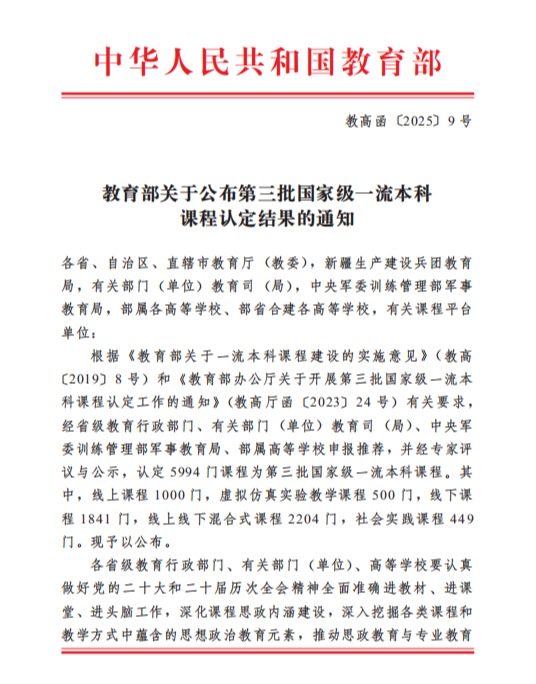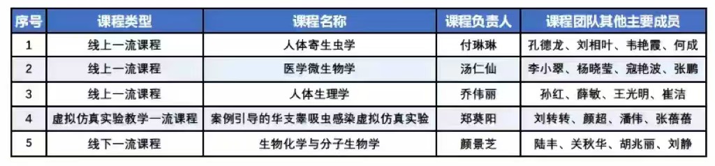 近日,第三批国家级一流本科课程认定结果公布(教高函〔2025〕9号),我院《医学微生物学》、《人体生理学》、《人体寄生虫学》、《案例引导的华支睾吸虫感染虚拟仿真实验》及《生物化学与分子生物学》5门本科课程被认定为国家级一流课程,其中线上一流课程3门,虚拟仿真实验教学一流课程1门,线下一流课程1门。