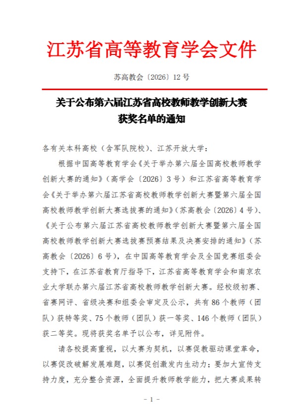 近日,江苏省高等教育学会发布《关于公布第六届江苏省高校教师教学创新大赛获奖名单的通知》(苏高教会〔2026〕12号),基础医学院尤红娟教授团队凭借深厚的医学教学素养与出色的教学设计,斩获特等奖。